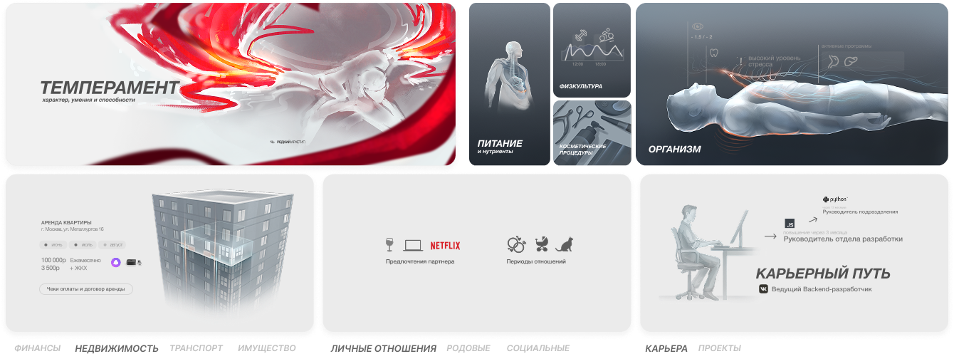 Визуализация инцидентов, хирургических вмешательств, анализов, контроль мед.документов, аптечки, отслеживание уровня жизни, факторов стресса и планирование новых медицинских процедур